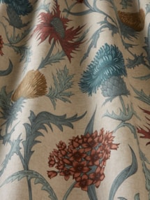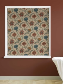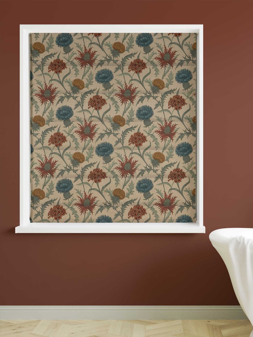 Embrace the enchanting beauty of autumn with our Acanthium Autumn Roman Blind. Its flowering acanthium pattern showcases a captivating blend of autumnal greens, rich blues, fiery reds, and warm yellows.