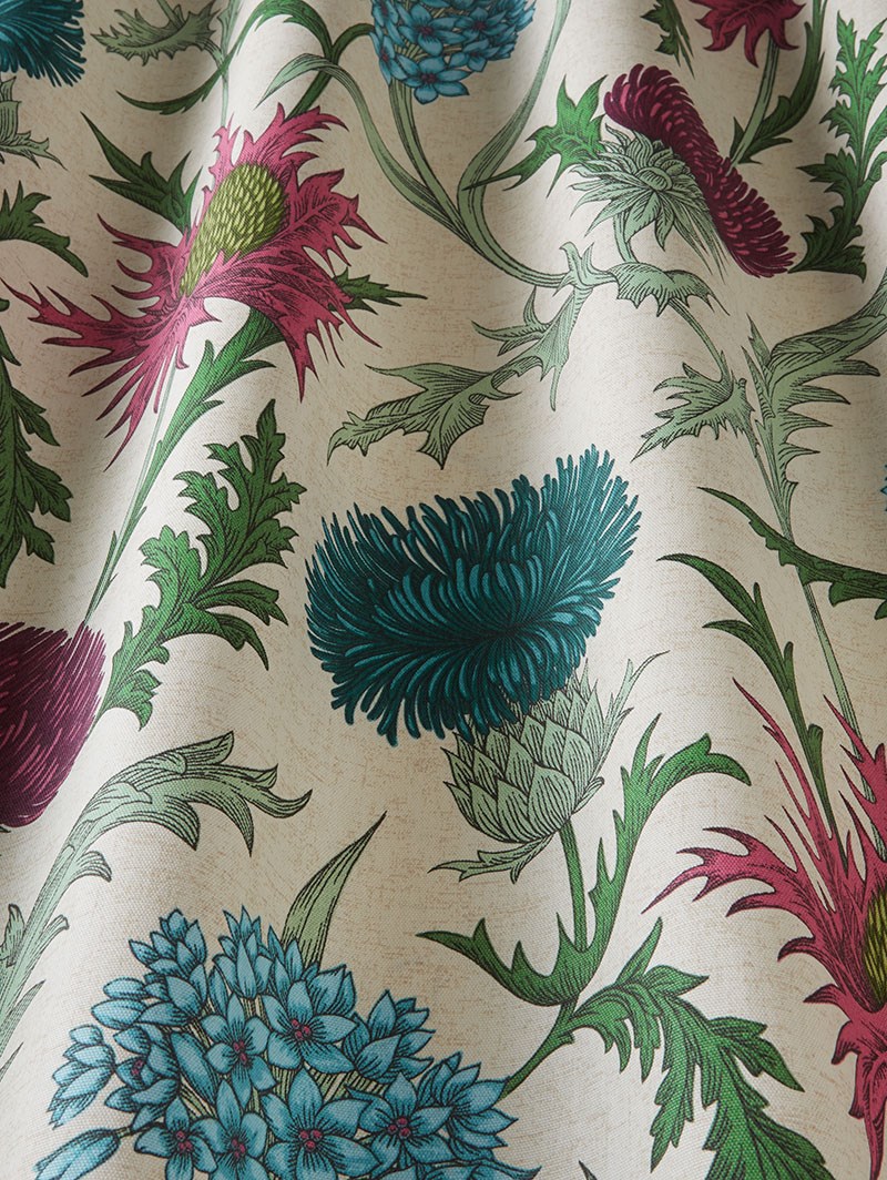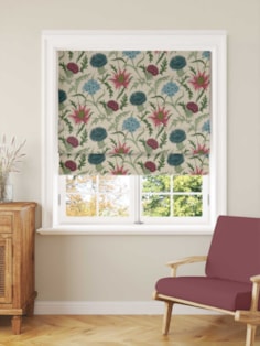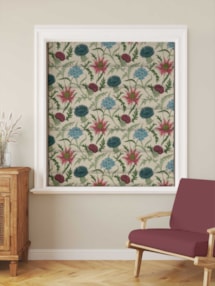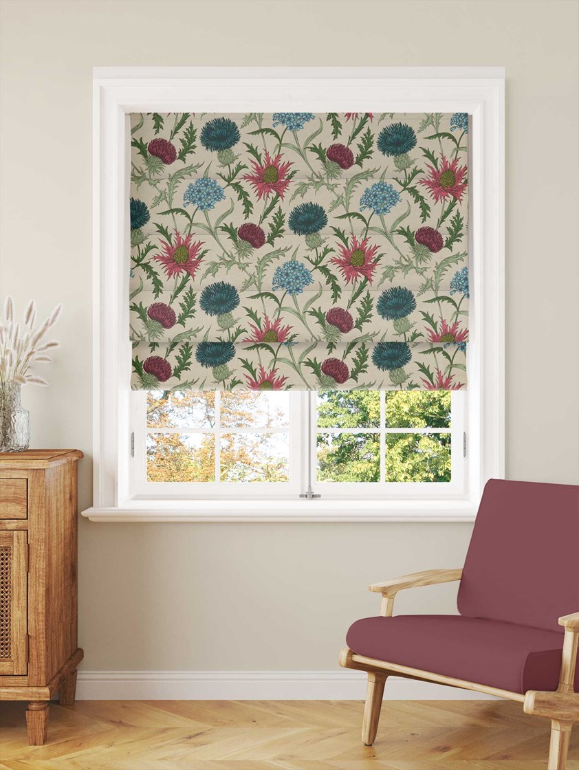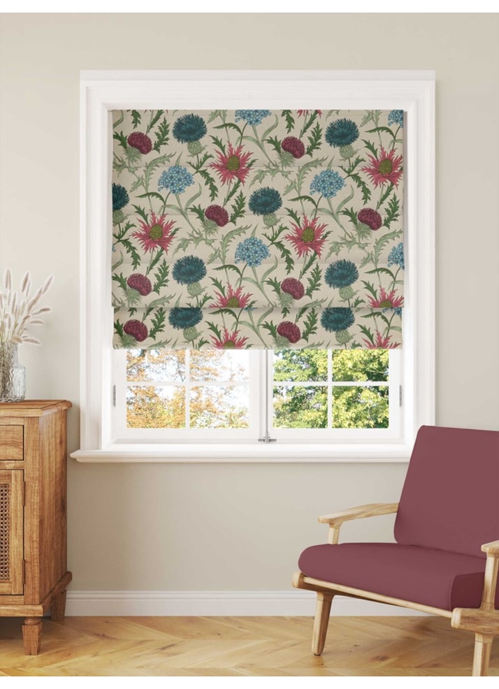 Add a burst of vibrant colour to your space with our Acanthium Carmine Roman Blind. Featuring a flowering acanthium pattern in vivid blues, mesmerizing teals, and lively pinks, this window treatment effortlessly infuses energy and style into any room.