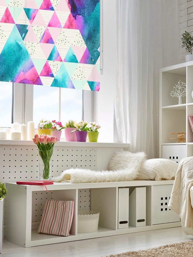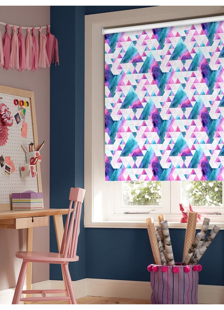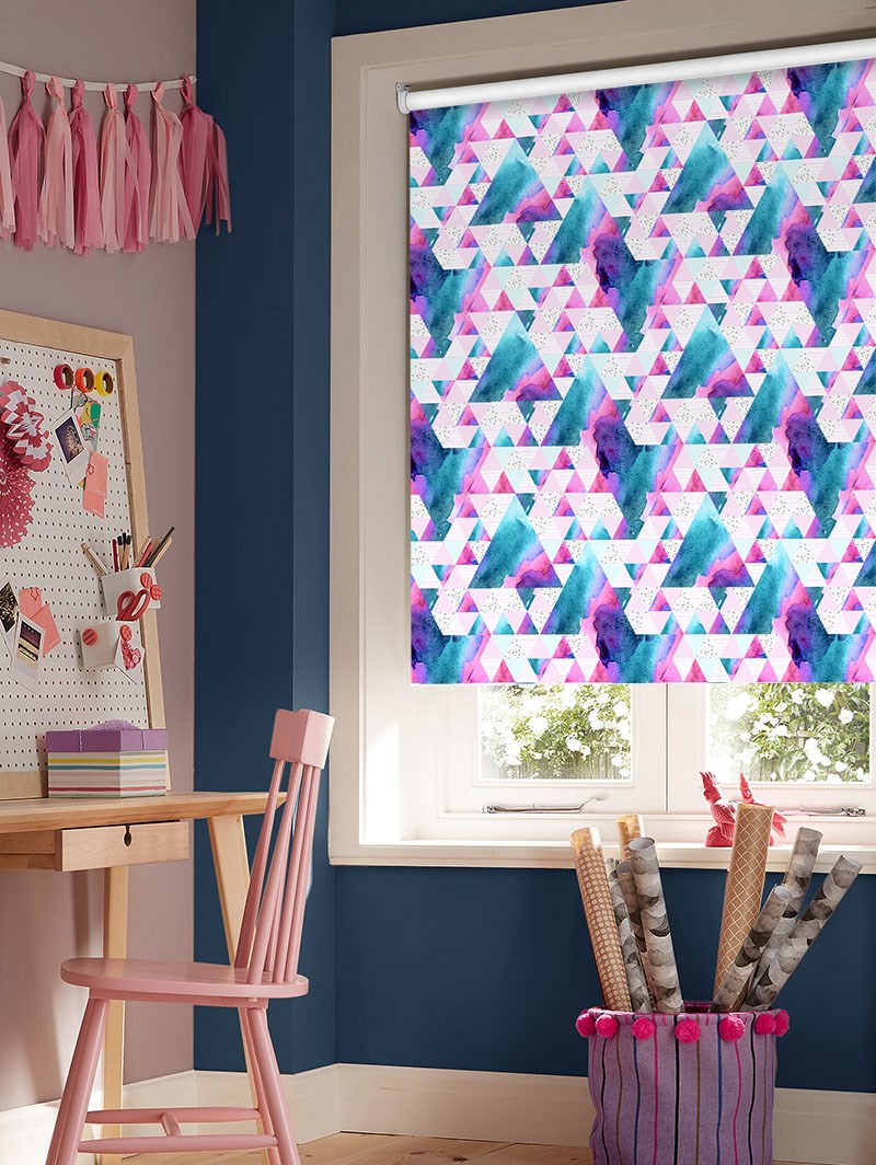 The watercolour trend is given pride of place on this beautifully bright and moden blind. Triangular panels of different patterns and colours come together tocreaete this eye catching design that would make a wonderful statement piece in many rooms.