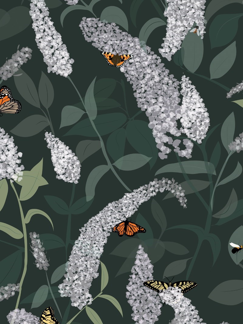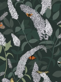 A staple of the hedgerows, train tracks borders and urban yards, the Buddleia or 'Butterfly Bush' with it's beautiful lance-like buds of flowers is a favourite of many insects. The white and grey blooms look beautiful against the sophisticated background shades of green with the orange and yellow butterflies adding a touch of citrussy magic.