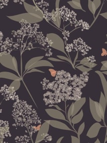 Sage green leaves and pale elderflower sprays scatter across a deep blue background adorned with fluttering orange butterflies - it's easy to see how Lorna was inspired to create this design by wandering around Britain's great gardens!