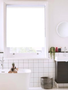 This lovely yellow toned off white blind is a wonderful choice for a bathroom, keeping things light and airy while providing subtle dimension against bright white tiles and porcelain.