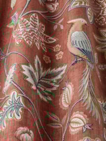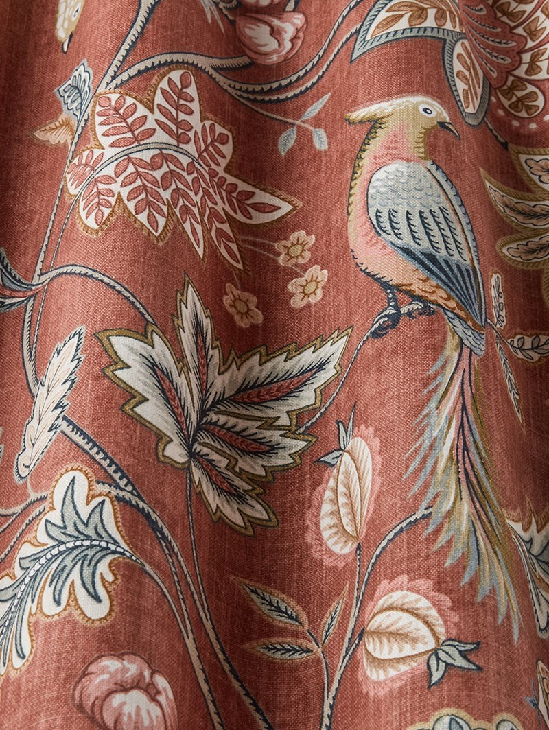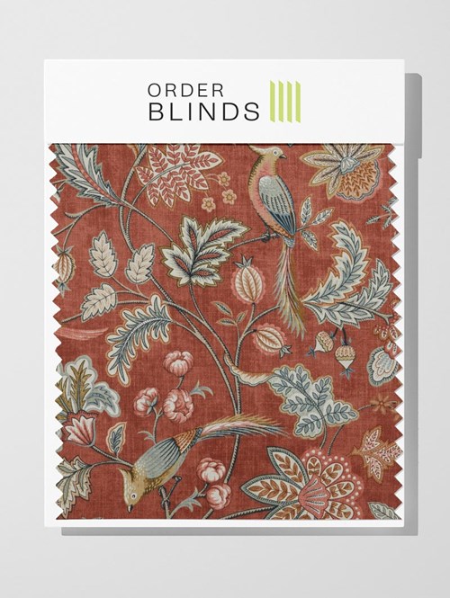 Infuse your space with vintage charm and tropical allure using our Chanterelle Auburn Roman Blind. Vintage-inspired flowering patterns blend seamlessly with adjacent tropical birds in muted greens, blues, and reds, all set against a warm and vibrant red backdrop.