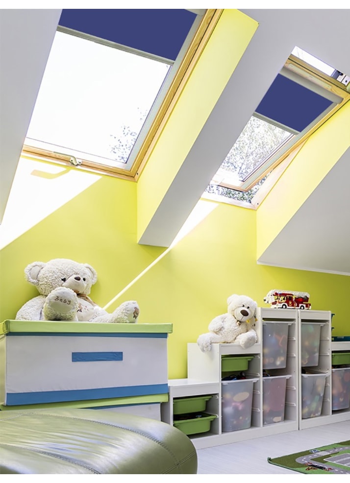 This playful & colourful Blue skylight blind is available to fit all of the most popular Velux roof window sizes. The mid blue colour of this blind's fabric sits between a sky blue & primary blue making it a wonderful choice for a child's bedroom or playroom.