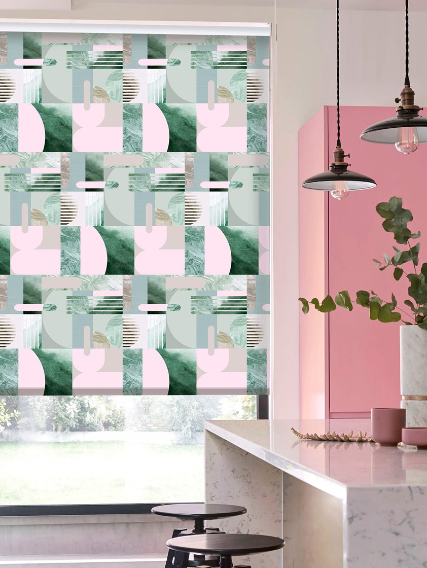 In stunning tones of pinks, green and blue this contemporary geometric roller blind incorporates the watercolour trend with beautiful marble inlays adding a splash of colour to your home.
