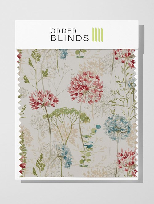 Elevate your decor with the Country Journal Haze Roman Blind, adorned with a delicate arrangement of flowers in blush pinks and baby blues, accented by spots of fern-like greens. Set against a linen-textured pattern, this charming window treatment creates a soothing and timeless ambiance, adding a touch of natural beauty to your space.