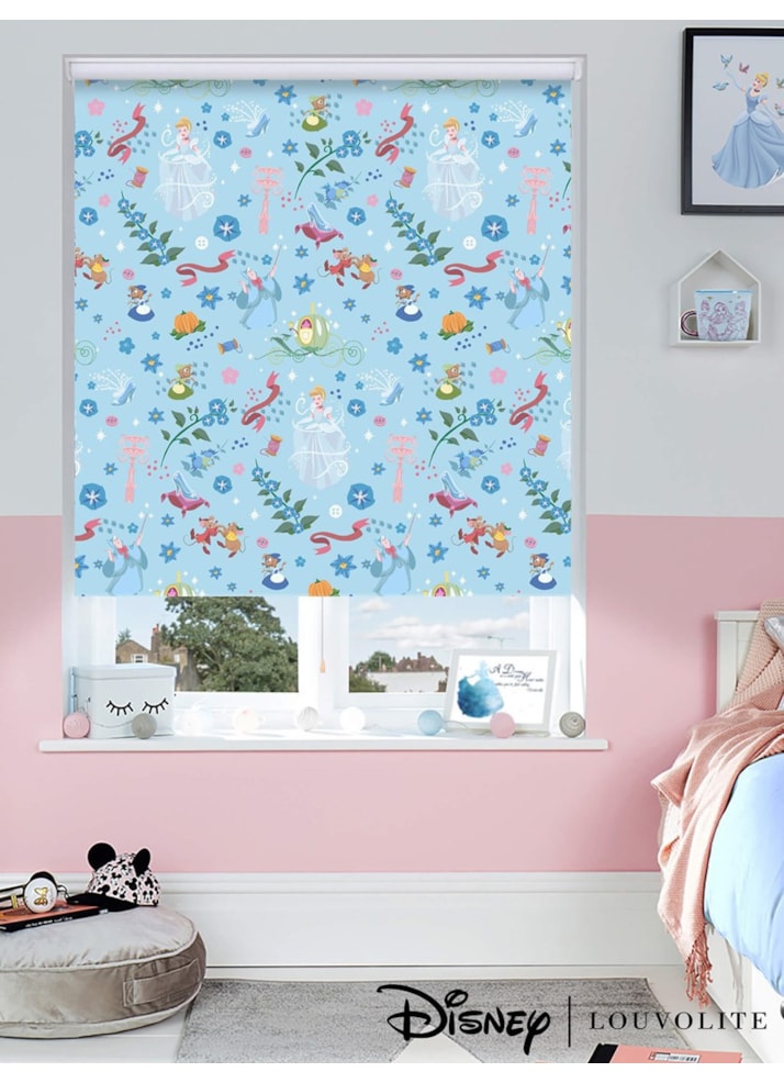Bring some magic to your little one's room with this beautiful blind, adorned with all your favourite characters from Disney's Cinderella. Spot friendly mice Jaq and Gus Gus dancing amongst pretty flowers, buttons, ribbons, pumpkins and Cinders herself on a pale blue background dotted with stars.