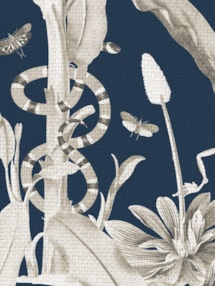 A beautiful base of rich navy blue is brought to life with a maximalist's dream design of plants and palm trees inhabited by birds, butterflies, snakes and other creatures. If you're looking to add impact to your window scheme this is a wonderful option, bringing both colour and dimension.