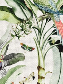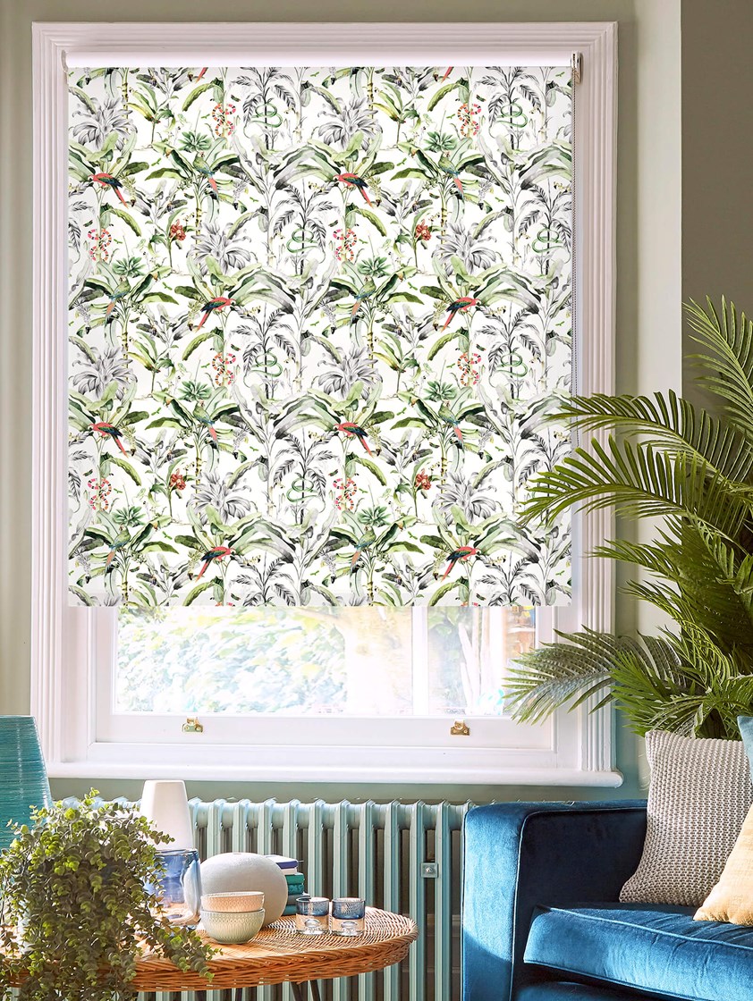Bring the rainforest into your home with this beautiful botanical design reminiscent of classic nature illustrations. Palms and plants adorn the white background, the perfect home for the birds, butterflies and other creatures seen amingst the leaves. A great alternative to a plain neutral blind, the design is highlighted with spot colouring to add interest and give a really unique feel to this blind.