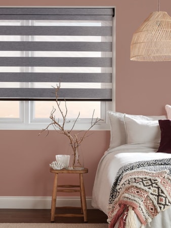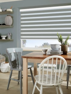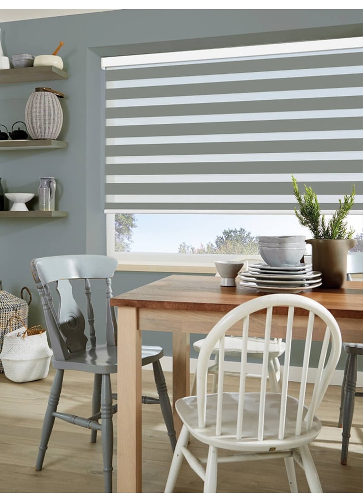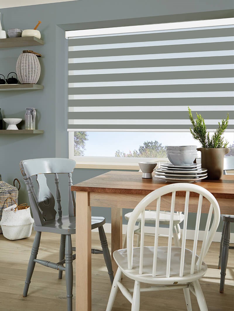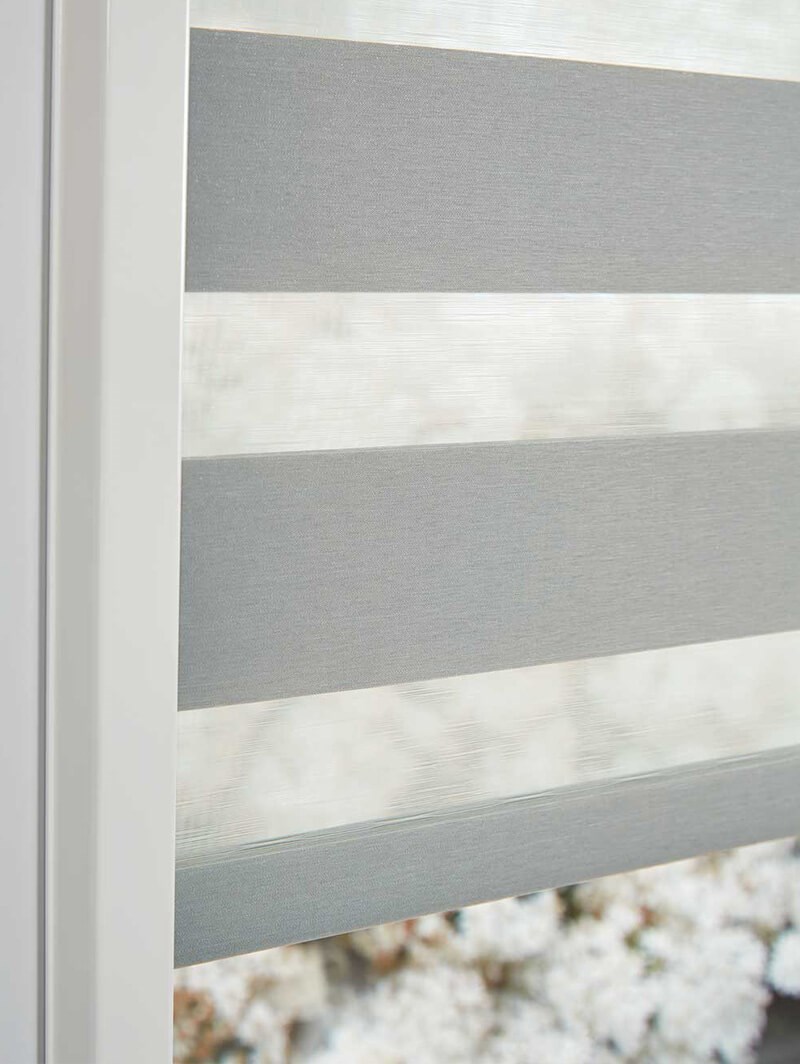 An attractive and innovative solution for many windows, our clever Day and Night blind system works using a looped piece of fabric so that when you raise or lower the blind you can make the alternating sheer and opaque stripes either align or disalign in varying amounts for amazing light control.