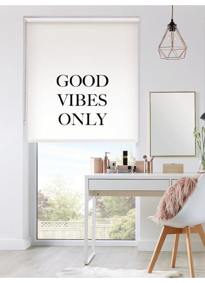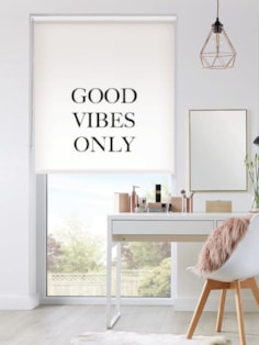 Keep the blues at bay and create a positive space with this fabulous ‘Good Vibes Only ‘ roller blind. Designed to inspire and uplift your mood every day, this motivational quote is printed in stylish black and white to create the upmost impact at your window and a talking point among your guests.