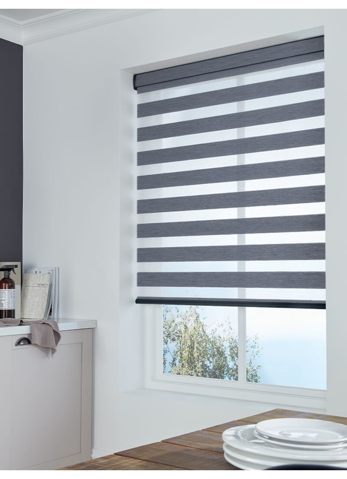 An attractive and innovative solution for many windows, our clever Day and Night blind system works using a looped piece of fabric so that when you raise or lower the blind you can make the alternating sheer and opaque stripes either align or disalign in varying amounts for amazing light control.