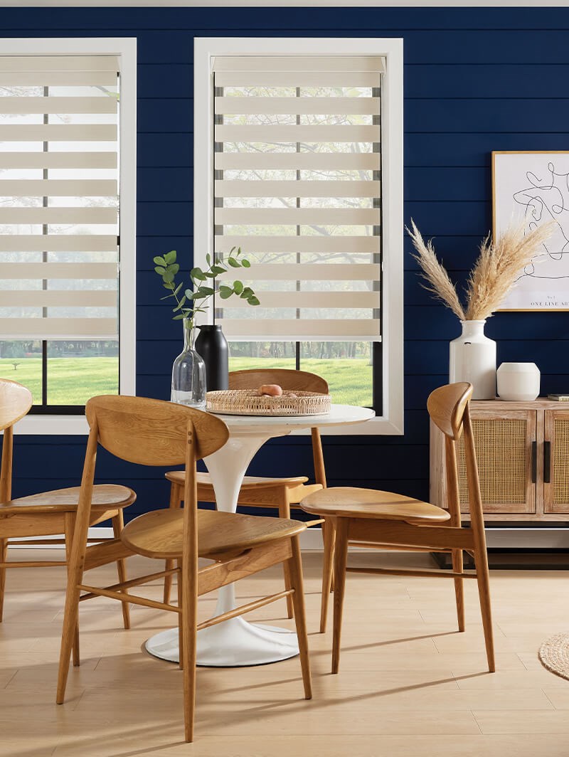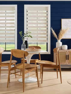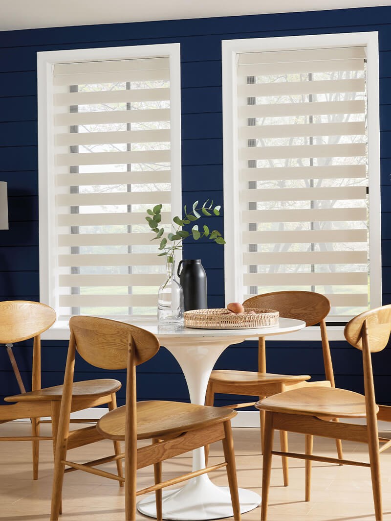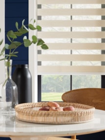 An attractive and innovative solution for many windows, our clever Day and Night blind system works using a looped piece of fabric so that when you raise or lower the blind you can make the alternating sheer and opaque stripes either align or disalign in varying amounts for amazing light control.
