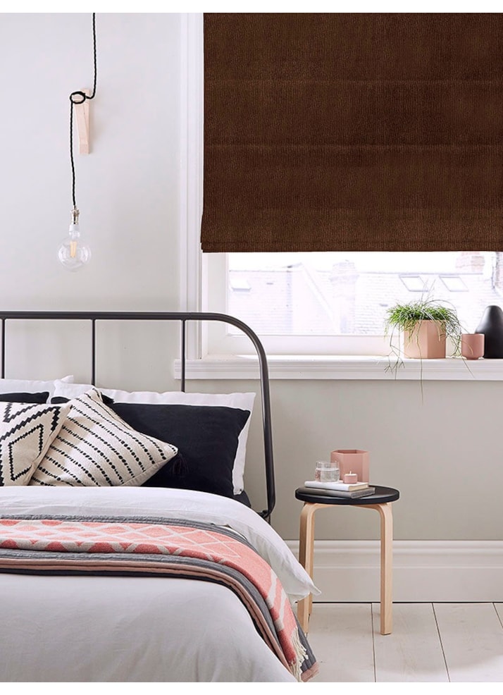 The Truffle shade of our dark brown roman blind offers a warm and elegant touch to any room it adorns. The versatility of this blind allows it to coordinate with a never-ending list of colour schemes, although creates a modern feel when paired with light grey painted walls.