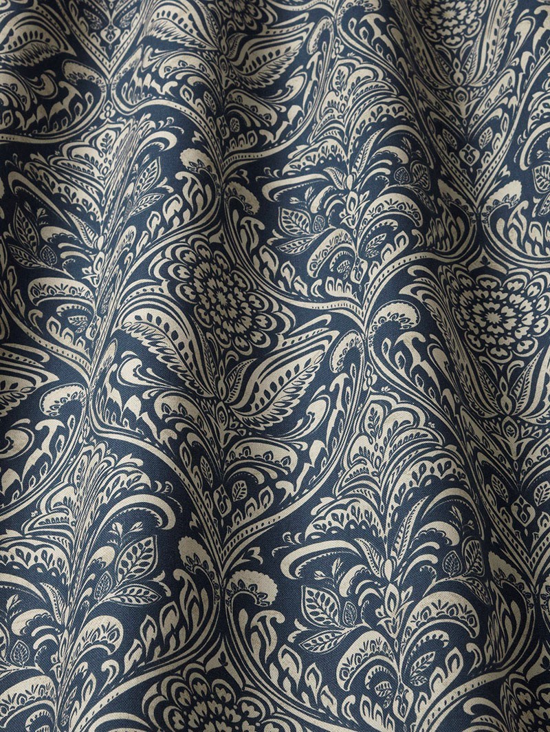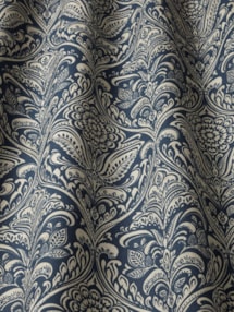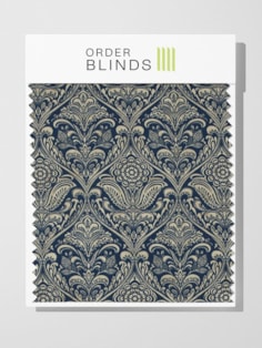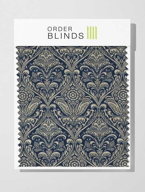 Elevate your decor with the regal elegance of the Hathaway Indigo Roman Blind, featuring a royal embroidery-inspired pattern on a rich navy blue background. The creamy beige pattern adds a touch of timeless beauty and sophistication to any room, creating a captivating and stylish ambiance.