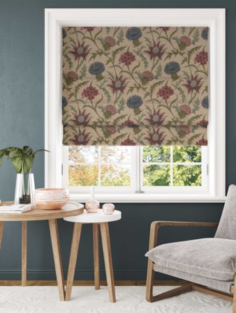Elevate your decor with the Hedgerow Pistachio Roman Blind, a cottage-style window treatment featuring an autumnal flower pattern on a soothing beige backdrop. Vibrant greens, blues, and mustard yellows add a touch of rustic charm and natural beauty to your space, creating a cosy and inviting ambiance.