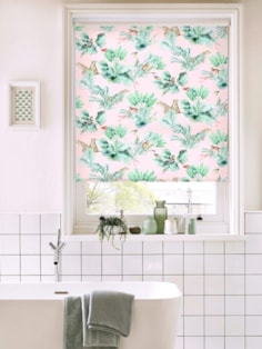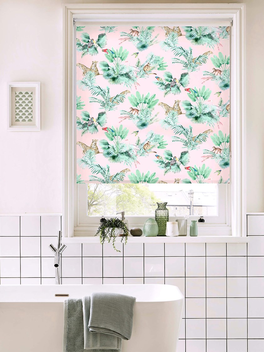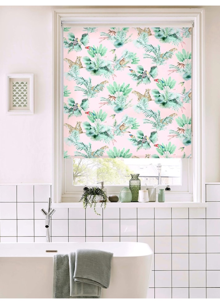 This wild and wonderful blind looks amazing in bathrooms, kitchens, bedrooms or any space that could do with a shot of colour and fun. The pale pink base is scattered with tropical palm bushes and beautiful wild animals and birds to give a modern take on a classic design element.