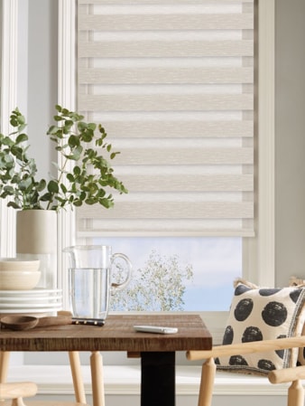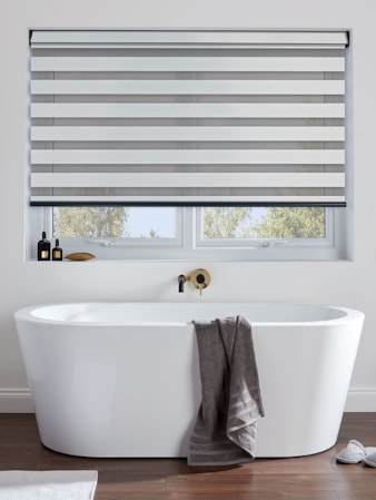 An attractive and innovative solution for many windows, our clever Day and Night blind system works using a looped piece of fabric so that when you raise or lower the blind you can make the alternating sheer and opaque stripes either align or disalign in varying amounts for amazing light control.