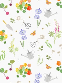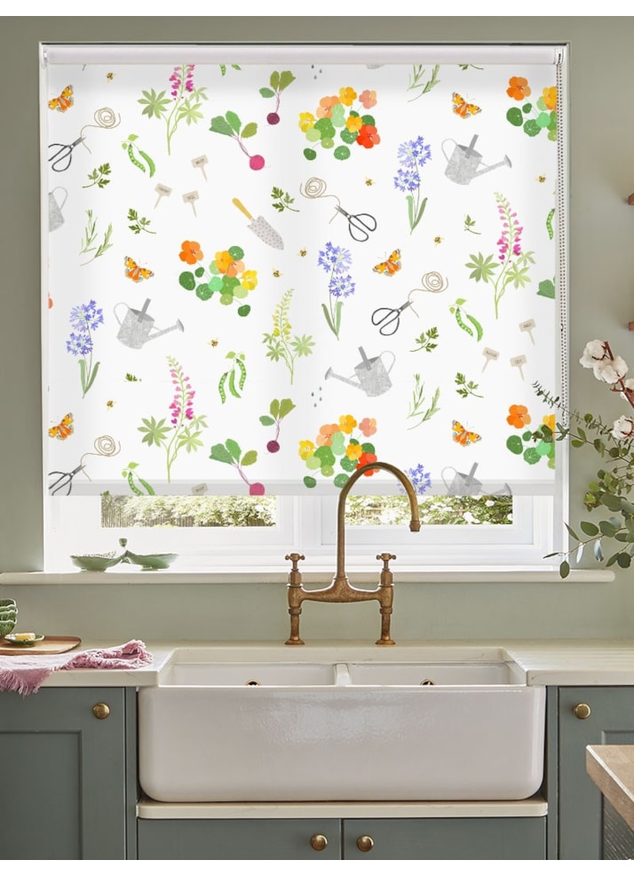 If you have discovered the joy of gardening, then this is gorgeous floral blind is the perfect choice for you. Bring the outdoors in with this charming pattern featuring an array of beautiful flowers, vegetables, bees, butterflies, and gardening essentials. Gorgeous tones of green, orange, blue and pink on an off white base make this design a great way to add a splash of colour and would look especially great in a contemporary or country style kitchen.