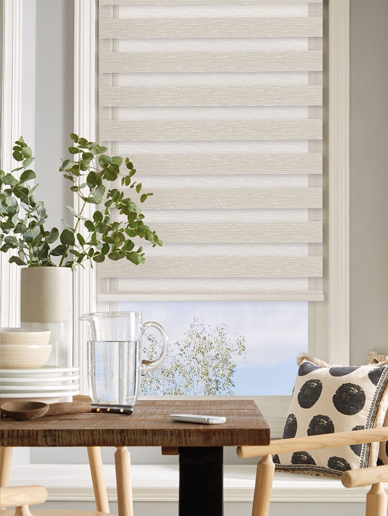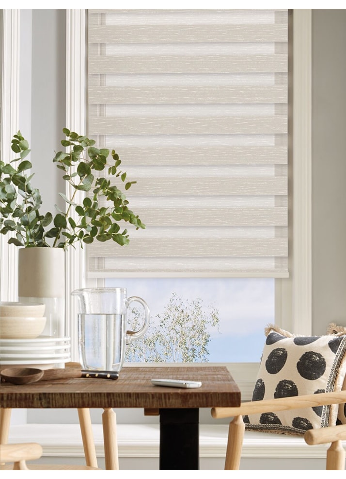 An attractive and innovative solution for many windows, our clever Day and Night blind system works using a looped piece of fabric so that when you raise or lower the blind you can make the alternating sheer and opaque stripes either align or disalign in varying amounts for amazing light control.