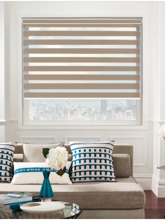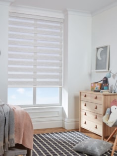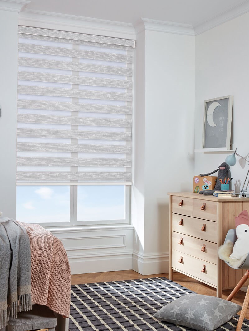 An attractive and innovative solution for many windows, our clever Day and Night blind system works using a looped piece of fabric so that when you raise or lower the blind you can make the alternating sheer and opaque stripes either align or disalign in varying amounts for amazing light control.