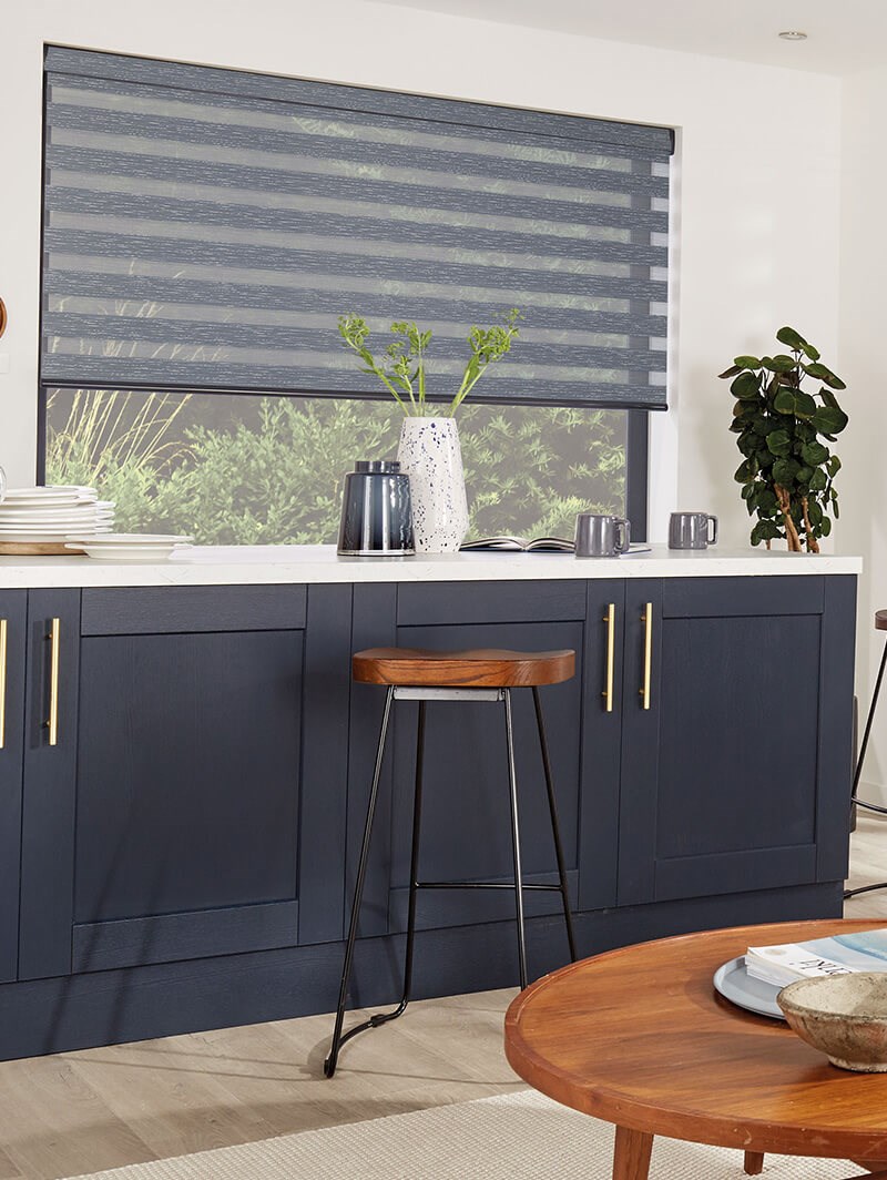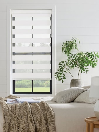 An attractive and innovative solution for many windows, our clever Day and Night blind system works using a looped piece of fabric so that when you raise or lower the blind you can make the alternating sheer and opaque stripes either align or disalign in varying amounts for amazing light control.