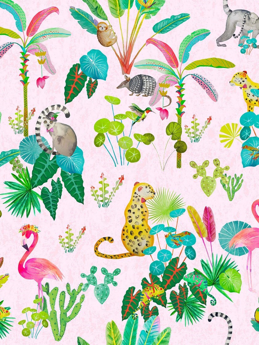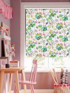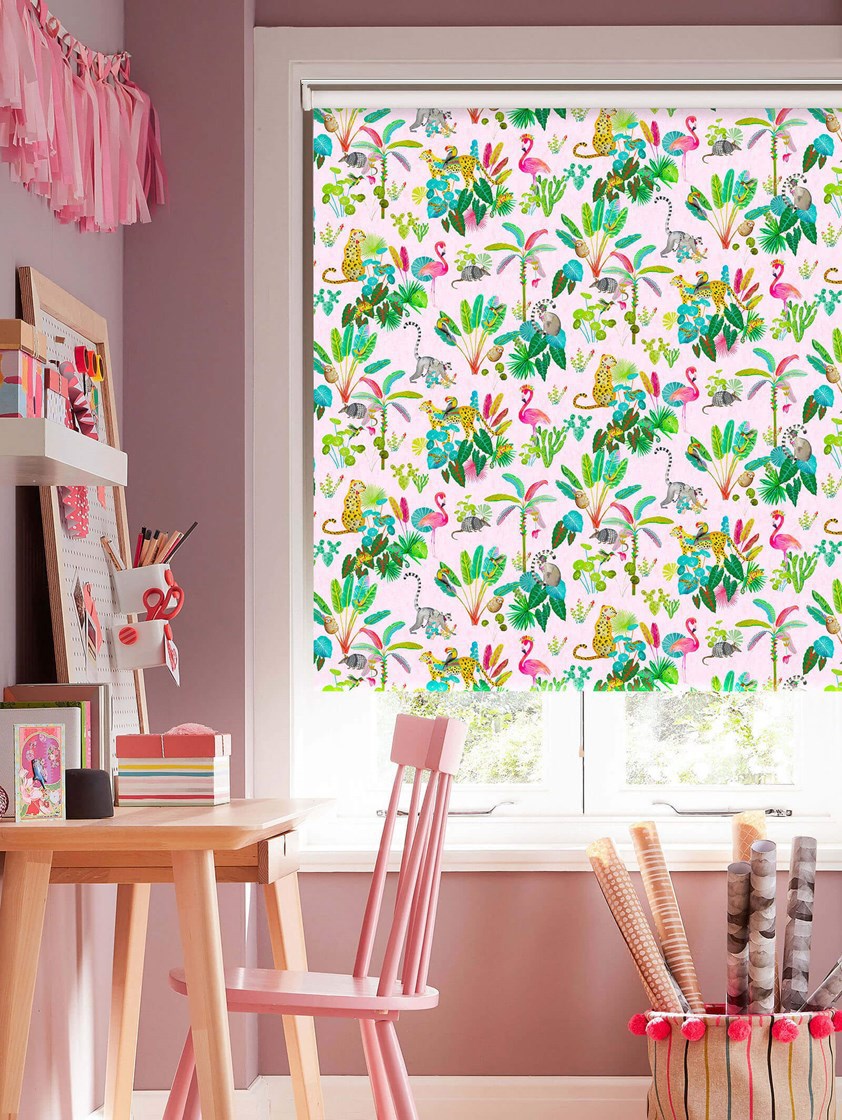 Journey through the rainforest to the Jungle Jamboree!. Whether its flamingos with flower crowns or Lemurs with top hats, this gorgeous blind sets a wonderful tropical scene and is sure to spark your childÕs imagination. The combination of vibrant colours on a pretty pink background with such a cute range of characters creates the perfect story for any bedroom or playroom.