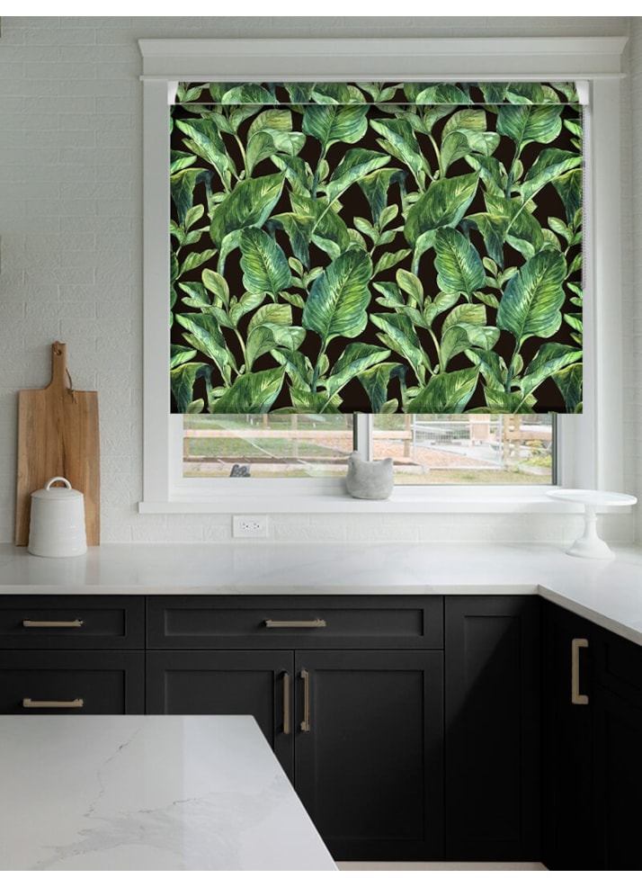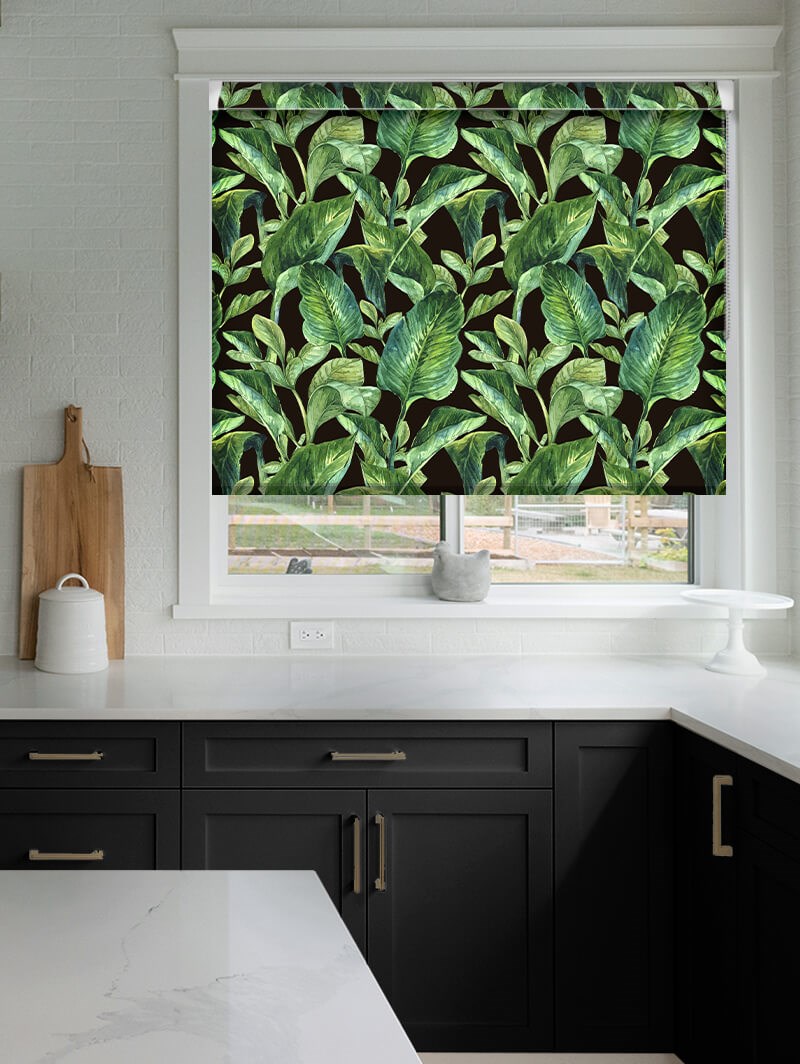 Bring style and drama to your room with our on trend Jungle Leaves Night Grip Fit blind, letting the black backdrop and gorgeous greenery bring an effortless feel of cool. We think this design looks especially chic when teamed with dark walls, velvet upholstery and a maximalist use of accessories.