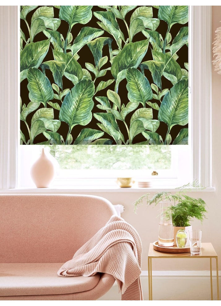 An oversized botanical leaf print stands out proudly from a dense black background making this on trend design a beautiful, bold window dressing option.