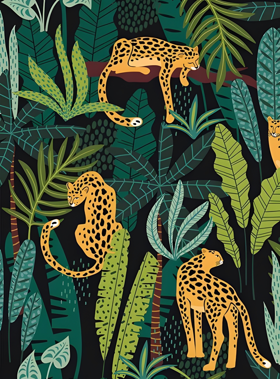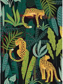 In a contemporary paper cut style, this dramatic jungle print features elegant cheetahs relaxing in their natural habitat.