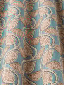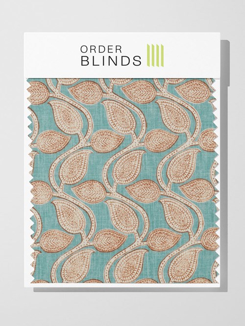 Elevate your decor with the Kantha Henna Roman Blind, showcasing a captivating snaking leaf pattern on a tropical ocean blue backdrop. Sunset burnt orange leaves infuse your space with a striking and contemporary ambiance, adding a touch of modern elegance to your room.