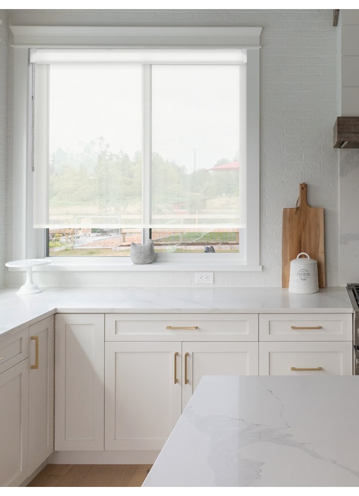 Our lace white 5% sunscreen spring loaded roller blind is a bright and airy option suited to any space where retaining natural light is key while preventing screen glare or UV damage.