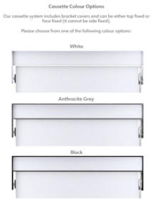 Upgrade your Double Roller Blind with an attractive cassette that covers the top roll of the blind, giving a neat and modern finish. The cassette is available in white, anthracite grey or black and will come complete with matching bracket covers so you can ensure it fits your decorating scheme perfectly.