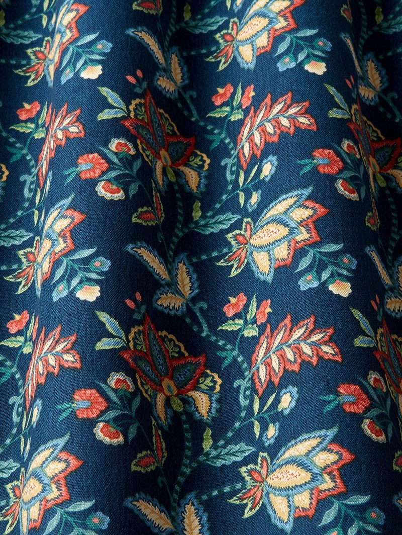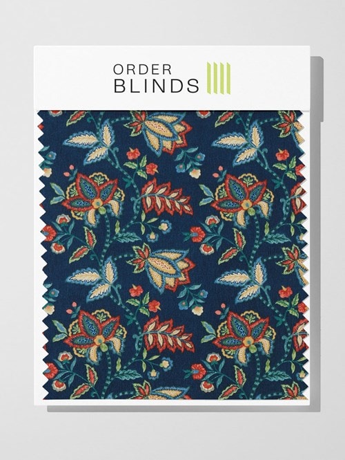 Elevate your decor with the Maharishi Midnight Roman Blind, showcasing a flowering patchwork-style pattern on a regal royal blue backdrop. Accents of burnt orange, baby blue, and hints of beige create a captivating and timeless ambiance, adding a touch of eclectic elegance to.