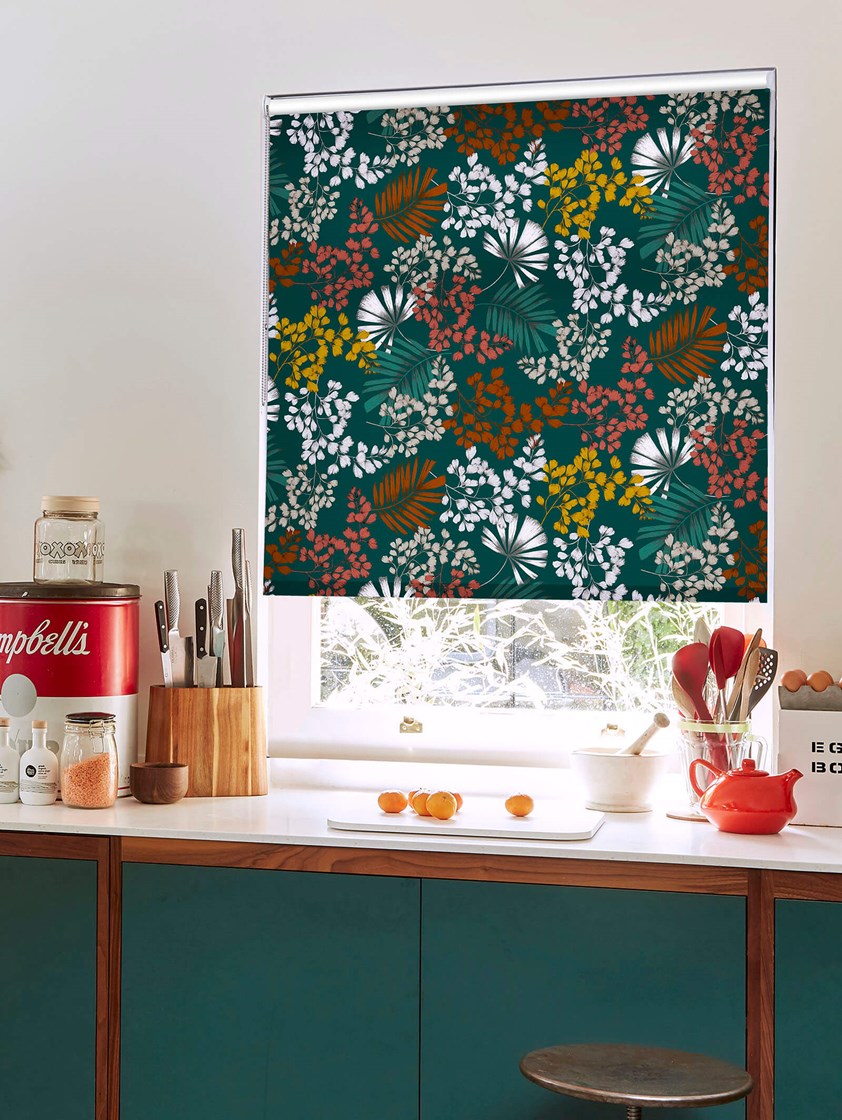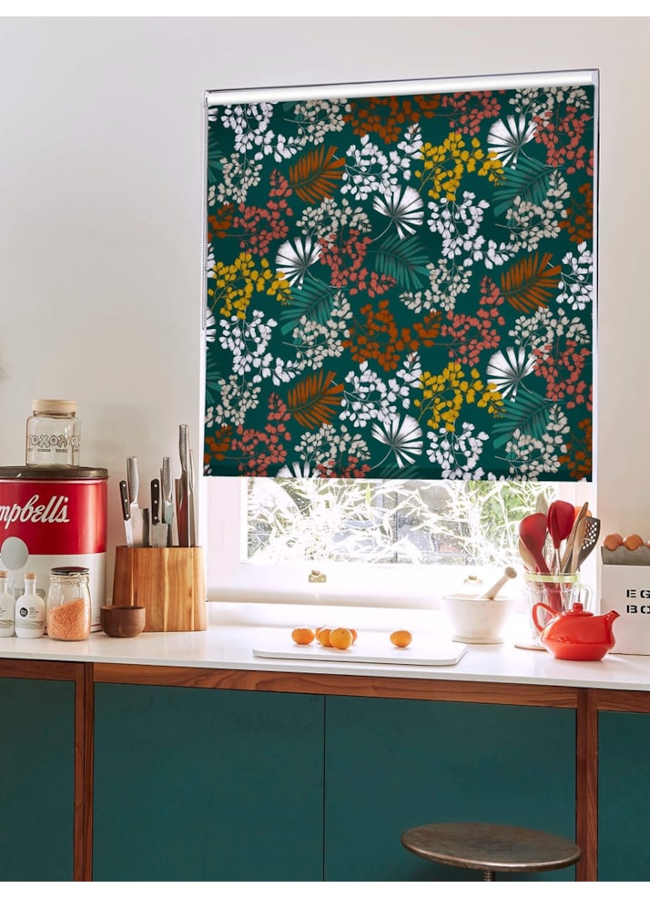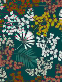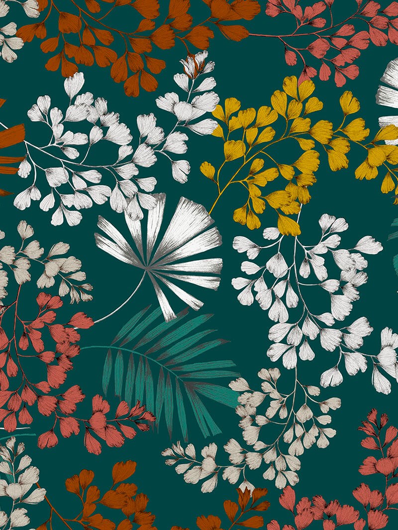 This terrific leaf design in on trend shades of teal, orange, red and mustard yellow creates a warming atmosphere while really making a statement. Leaves and foliage sprays are scattered across the rich blue-green background accented with pops of white that make it easy to add to even a plain white room, making this exclusive design a winner for any home.