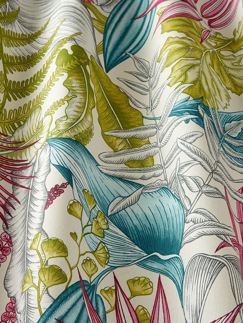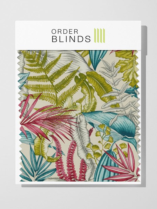 Infuse your space with the vibrant beauty of the Maldives Begonia Roman Blind, showcasing a tropical island leaf pattern in vibrant pinks. Tropical shades of blue and palm tree greens create a captivating and lively ambiance, adding a touch of exotic paradise to your decor.
