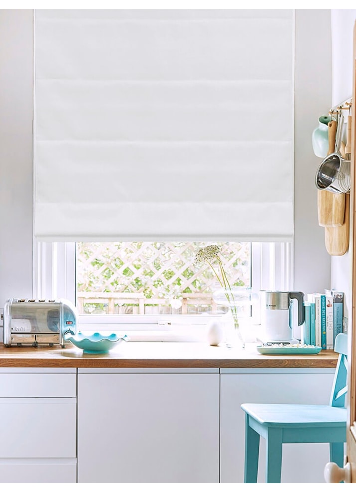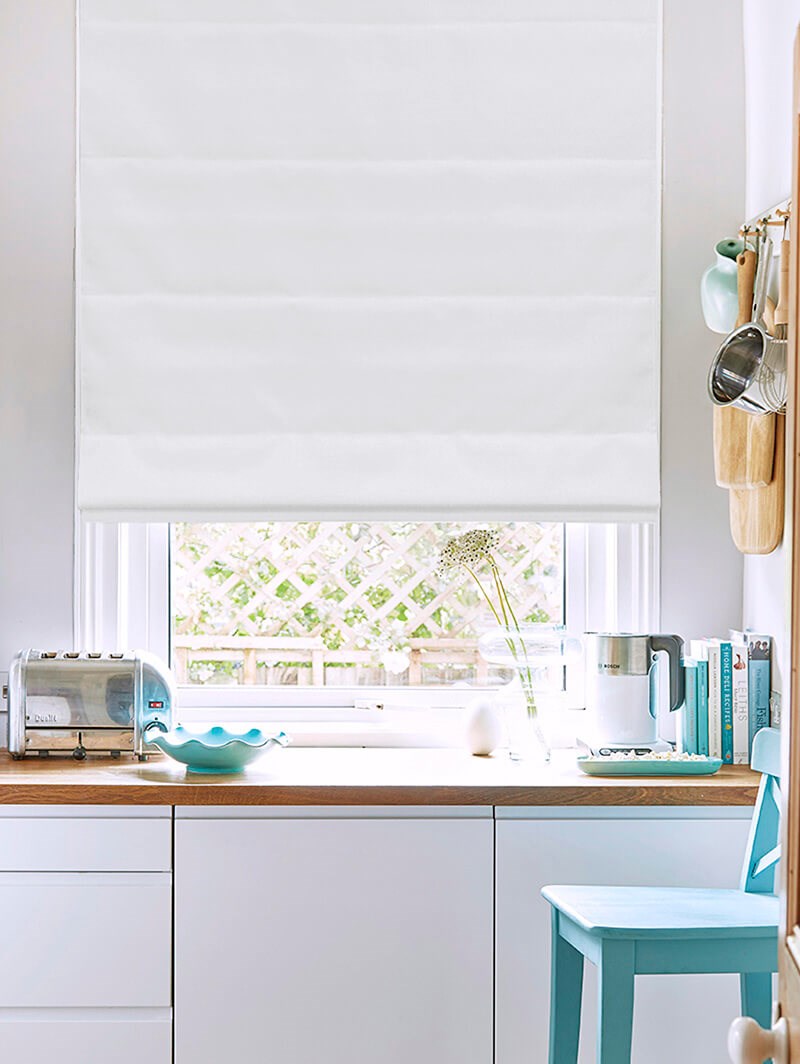 A classic white roman blind works perfectly in any room to offer privacy and light control while remaining bright and airy. The folds of the fabric bring softness to even the most minimalist space, making it feel more welcoming and complete.
