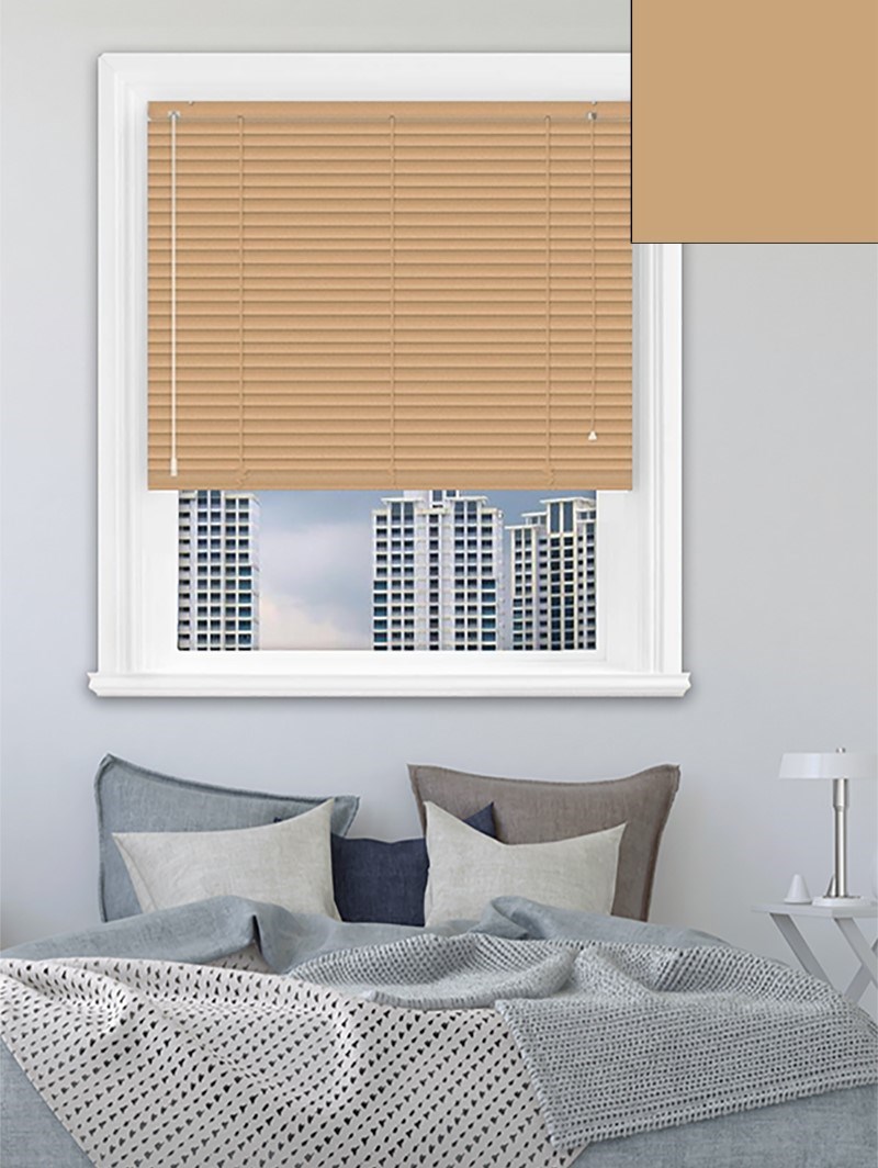 A gentle shade of brown infused with caramel, our Matte Tawny light brown aluminium venetian blind is perfectly coordinated with wooden furnishings, making this blind the ideal window dressing for a kitchen or a dining room. Pair with pale shades of yellow, soft orange, teal or a classic black for a modern touch to your home.
