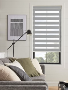An attractive and innovative solution for many windows, our clever Day and Night blind system works using a looped piece of fabric so that when you raise or lower the blind you can make the alternating sheer and opaque stripes either align or disalign in varying amounts for amazing light control.