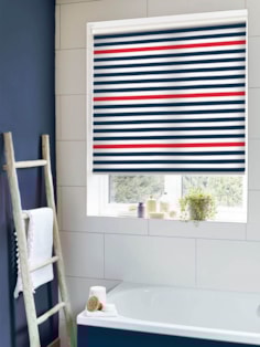 Give your bathroom a coastal, seaside feel with this nautical inspired stripe. Sophisticated tones of navy blue are right on trend and have been teamed with a dash of bright red to create impact at your window and a focal point to your space.