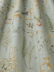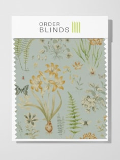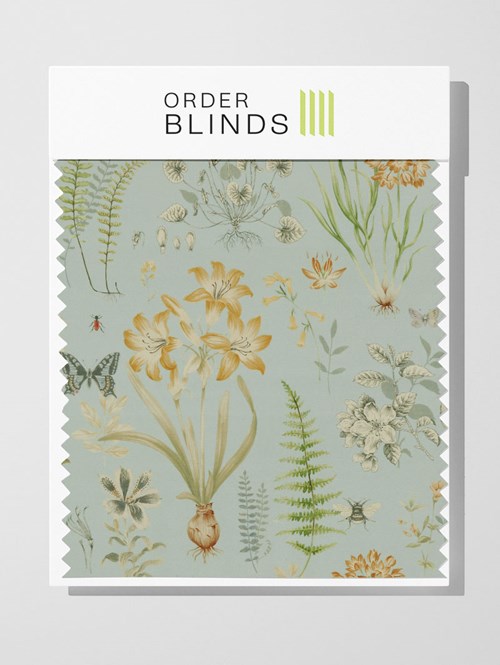 Transform your space with the Observatory Seaspray Roman Blind, featuring a delicate springtime flowering pattern with adjacent butterflies, bees, and ladybugs on a soft baby blue backdrop. Botanical greens and classic golds create a soothing and whimsical ambiance, adding a touch of natural beauty and understated elegance to your decor.