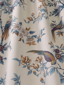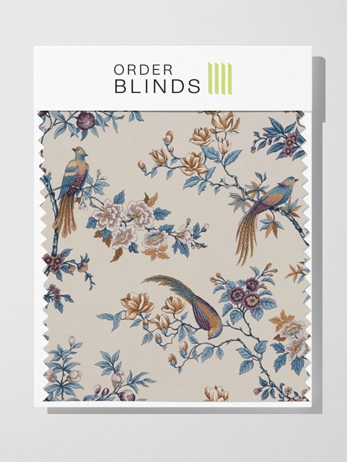Elevate your decor with the Orientals Delft Roman Blind, showcasing a delicate flowering pattern with adjacent perched birds on a classic ivory backdrop. Accents of vibrant teal, deep aubergine purples, and classic golds create a captivating and timeless ambiance, adding a touch of natural beauty and opulent charm to your space.