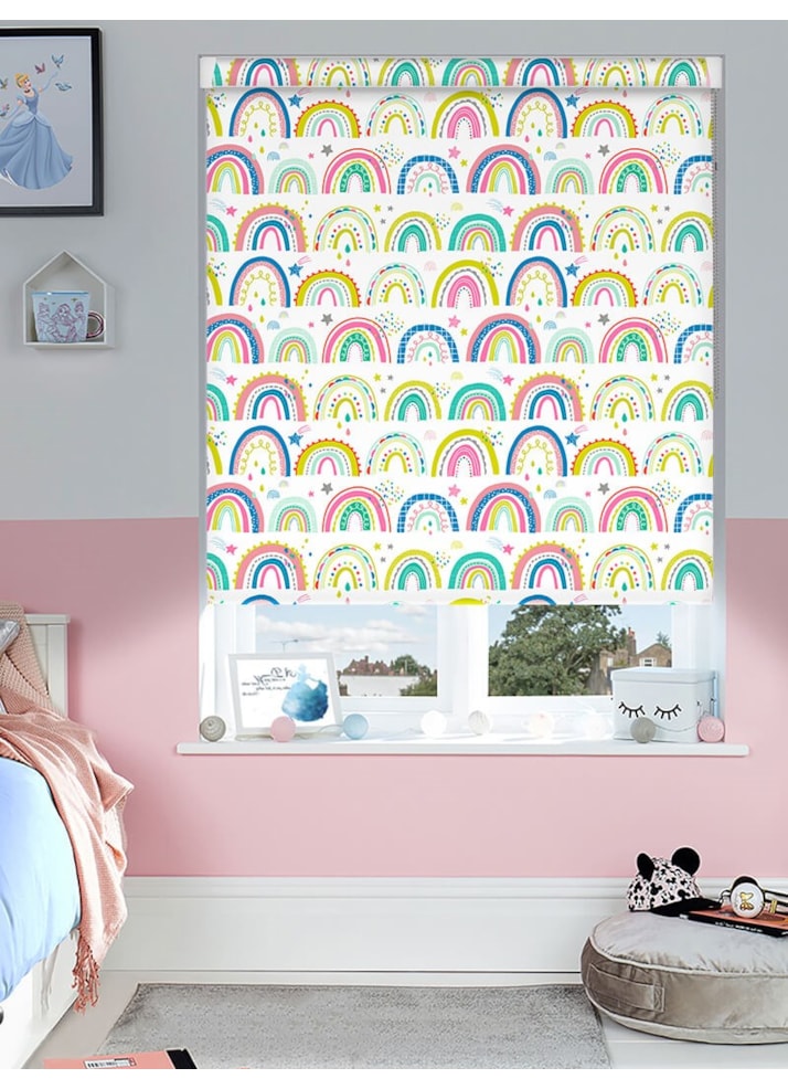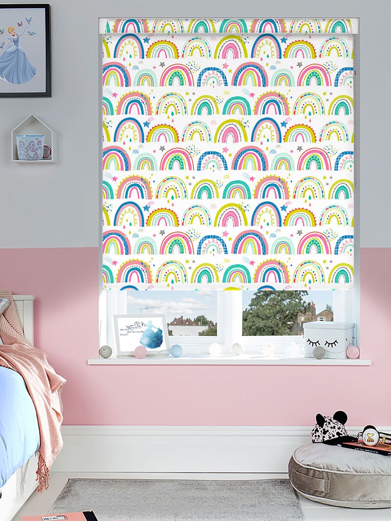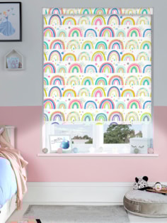 Beautiful brightly coloured rainbows decorate a clean white blind, making even the plainest of rooms feel full of fun and charm. The perfect way to bring cheer to a little one's room.
