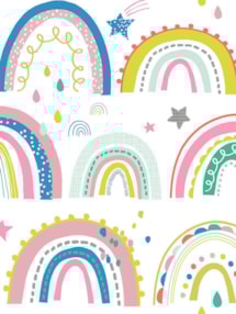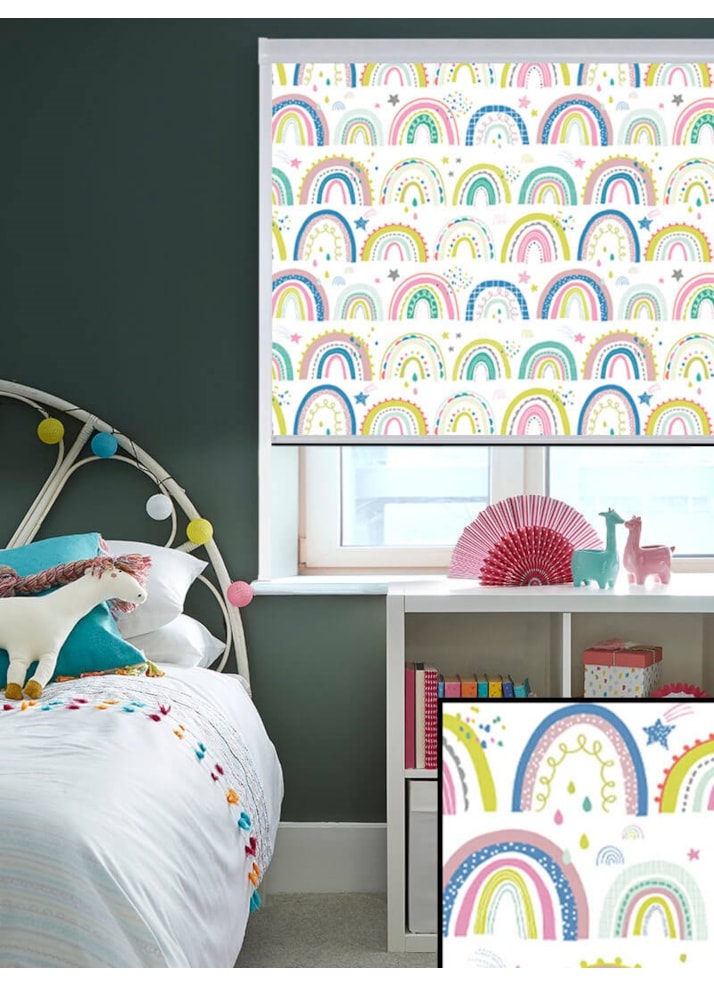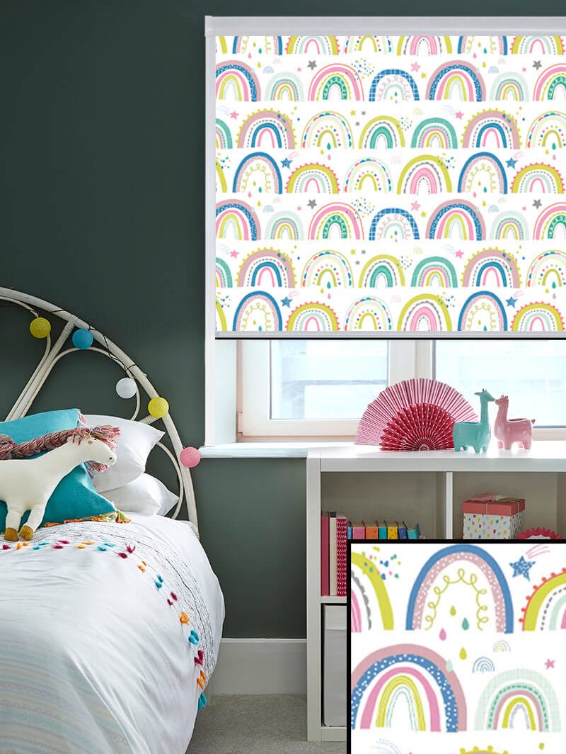 Beautiful brightly coloured rainbows decorate a clean white blind, making even the plainest of rooms feel full of fun and charm. The perfect way to bring cheer to a little one's room.