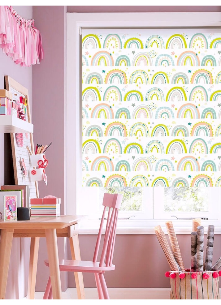 Perfectly pretty pastel rainbows adorn this lovely white blind, adding a bright and airy pop of colour to bring charm to a room. This cheery blind is sure to be a hit!
