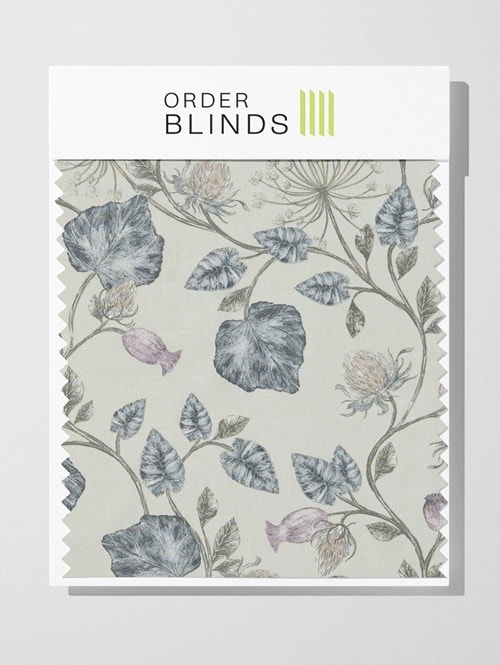 Elevate your decor with the Parchment Feather Roman Blind, featuring a delicate flowering pattern on a cool ivory linen backdrop. Accents of deep royal blue and light blush pink flowers create a captivating and timeless ambiance, adding a touch of natural beauty and understated elegance to your space.