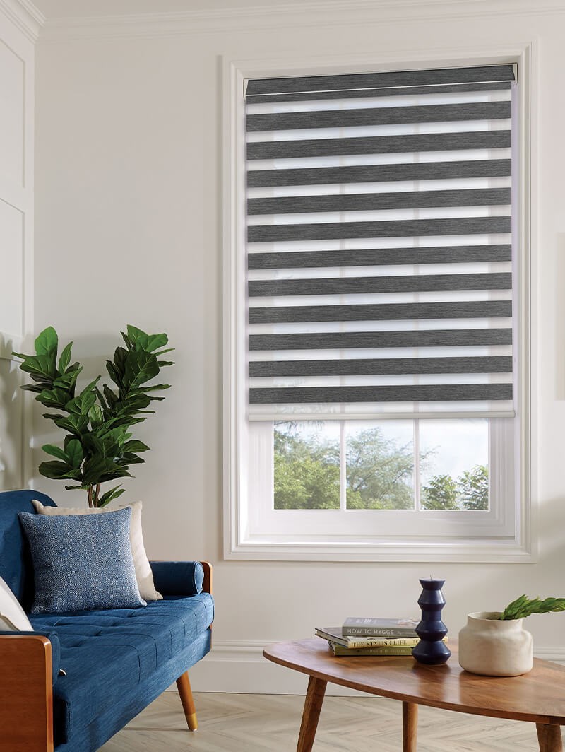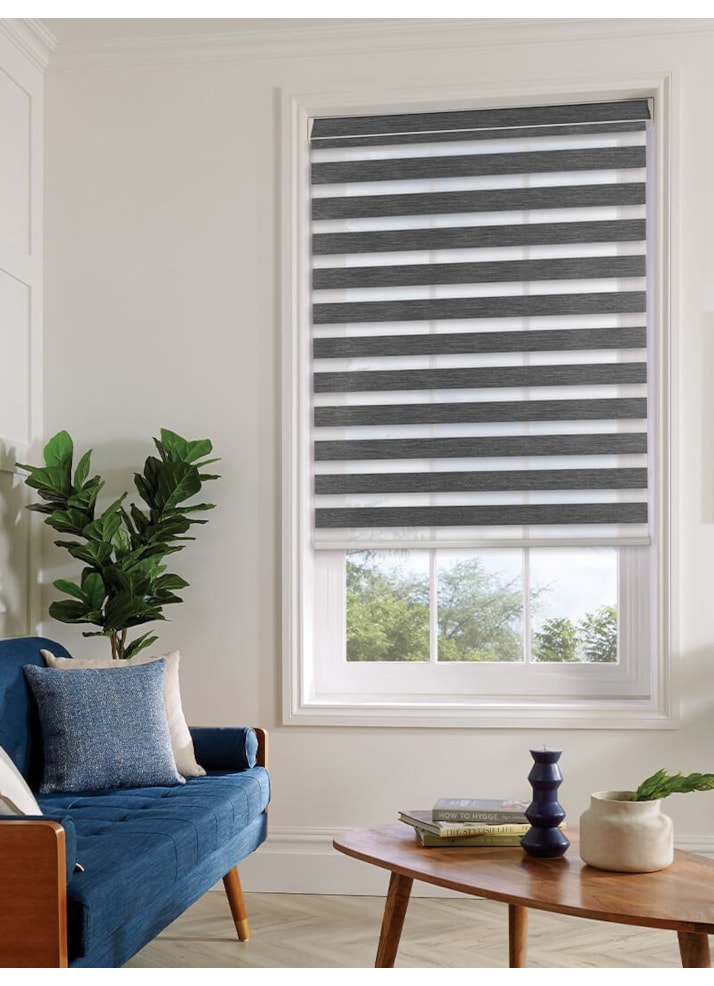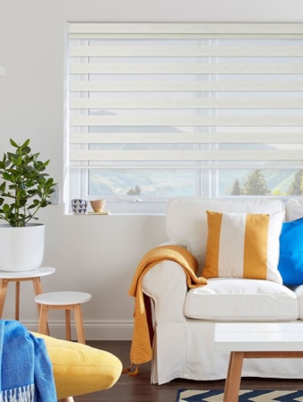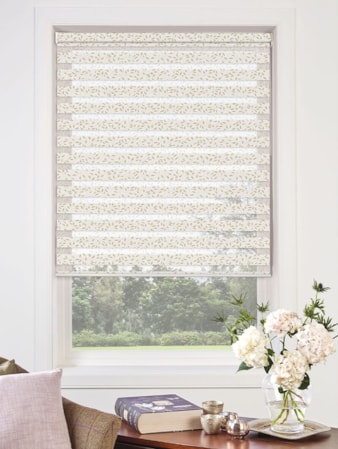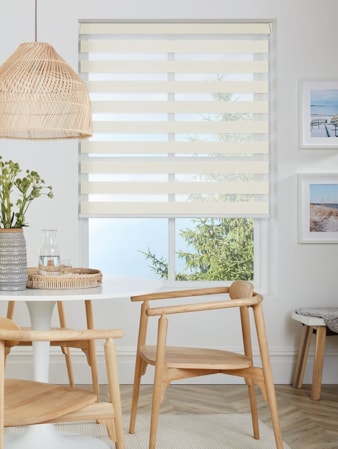 An attractive and innovative solution for many windows, our clever Day and Night blind system works using a looped piece of fabric so that when you raise or lower the blind you can make the alternating sheer and opaque stripes either align or disalign in varying amounts for amazing light control.