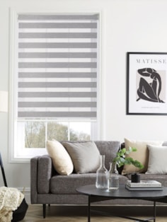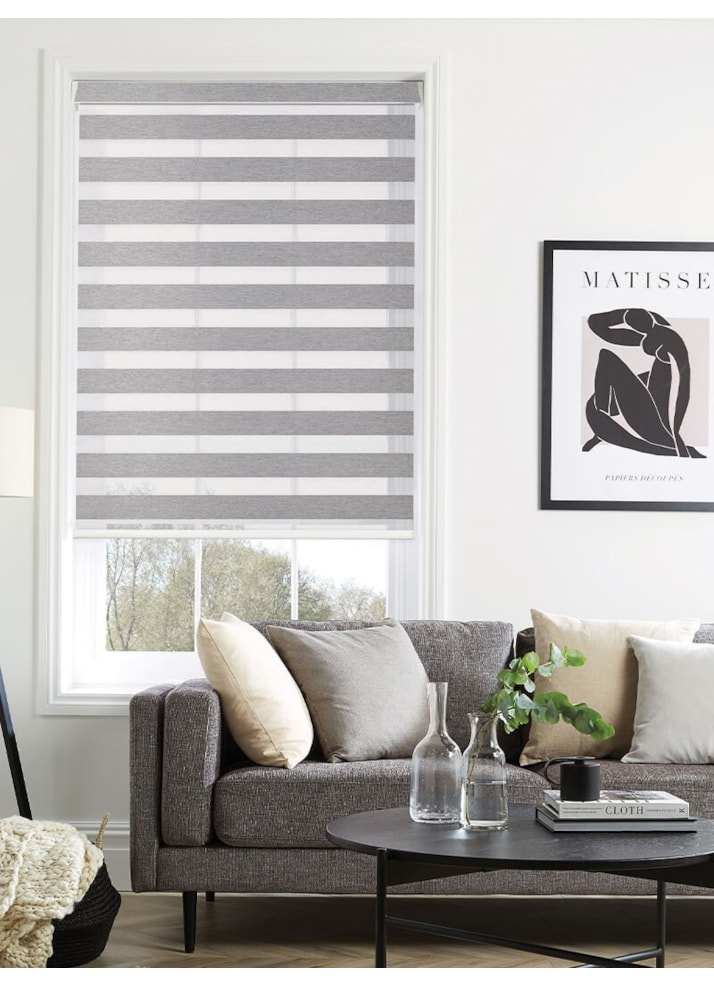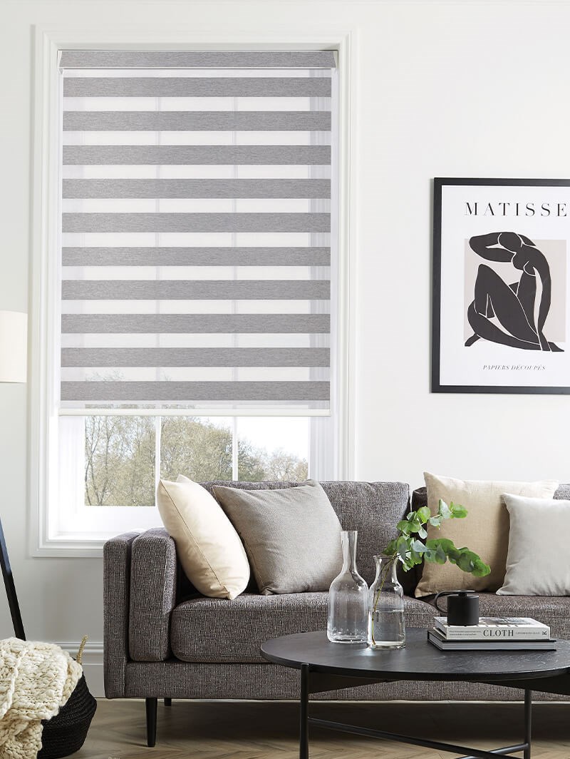 An attractive and innovative solution for many windows, our clever Day and Night blind system works using a looped piece of fabric so that when you raise or lower the blind you can make the alternating sheer and opaque stripes either align or disalign in varying amounts for amazing light control.
