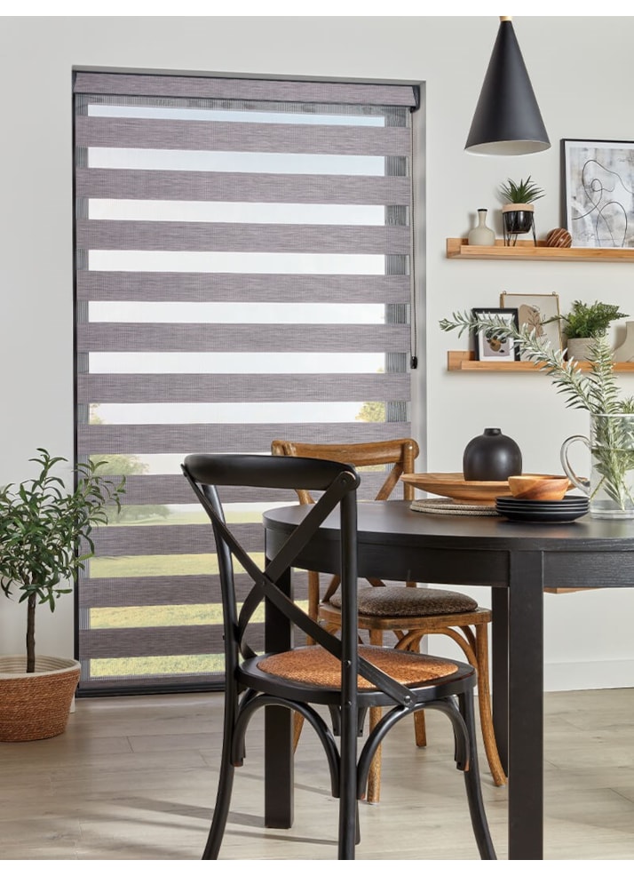 An attractive and innovative solution for many windows, our clever Day and Night blind system works using a looped piece of fabric so that when you raise or lower the blind you can make the alternating sheer and opaque stripes either align or disalign in varying amounts for amazing light control.