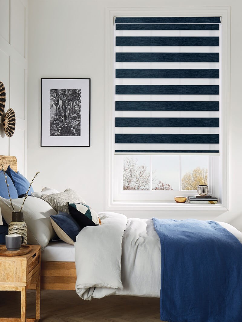 An attractive and innovative solution for many windows, our clever Day and Night blind system works using a looped piece of fabric so that when you raise or lower the blind you can make the alternating sheer and opaque stripes either align or disalign in varying amounts for amazing light control.